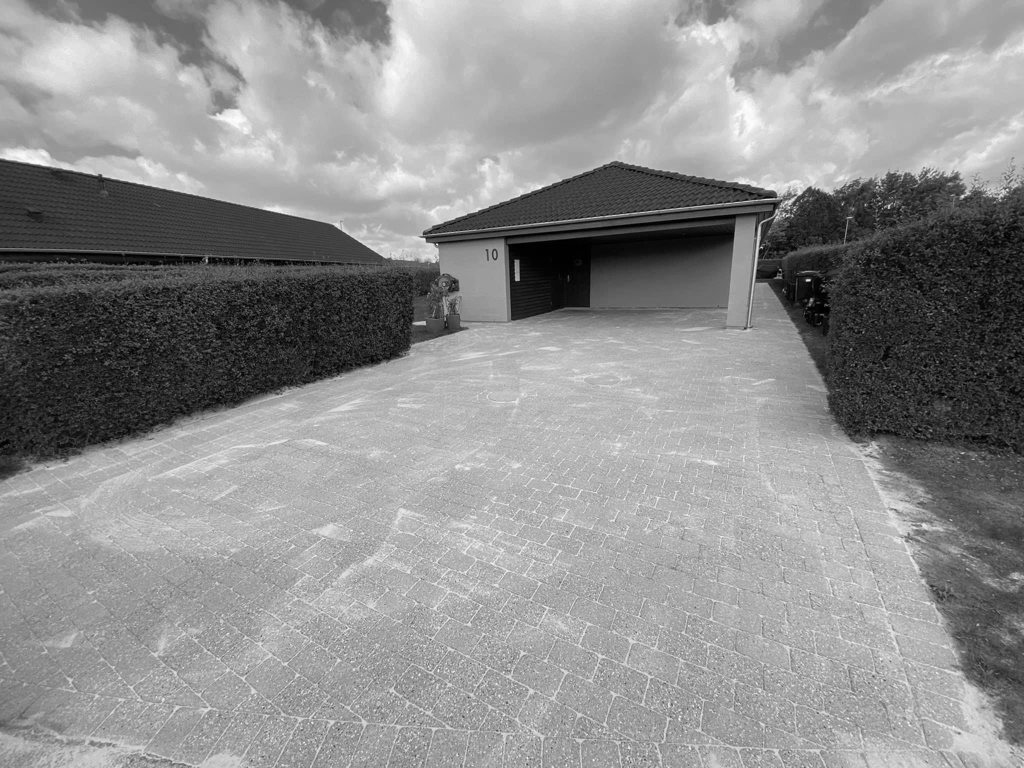 - Levering og fejning af fugesand: Vi afsluttede med at levere og feje nyt fugesand ind i flisernes fuger. Dette stabiliserer fliserne, giver et ensartet udtryk og forhindrer nyt ukrudt i at vokse op mellem fugerne.