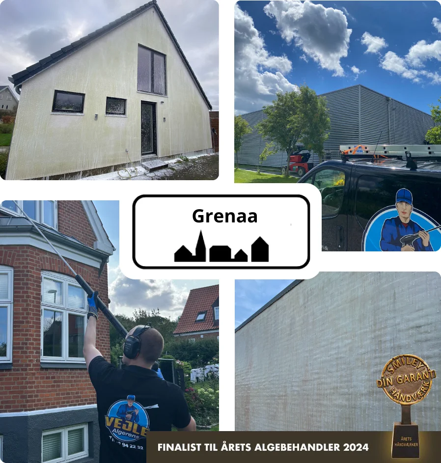 Hos Vejle Algerens tilbyder vi professionel facaderens i Grenaa og omegn til både private og erhverv. Vi anvender skånsomme og effektive metoder samt miljøgodkendte produkter, der fjerner alger, snavs og belægninger uden at beskadige facaden. Resultatet er en ren, pæn og velholdt facade, der forbedrer ejendommens helhedsindtryk og bidrager til en længere levetid.