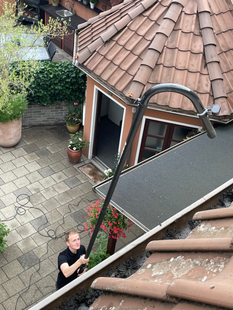 Når opmålingen er færdig, starter vi rensningen fra jorden med et kraftfuldt sugesystem, der effektivt fjerner blade, mos og snavs – helt op til 16 meters højde.